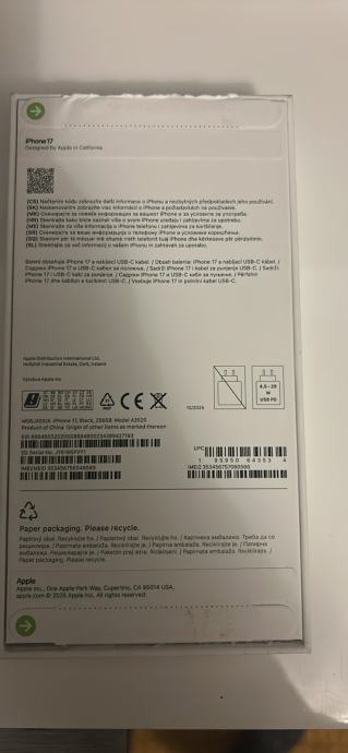 Prodam iPhone 17 256 GB črne barve, nov, neaktiviran, samo odprt. Prodam z nameščeno zaščito zaslona in dvema ovitkoma.