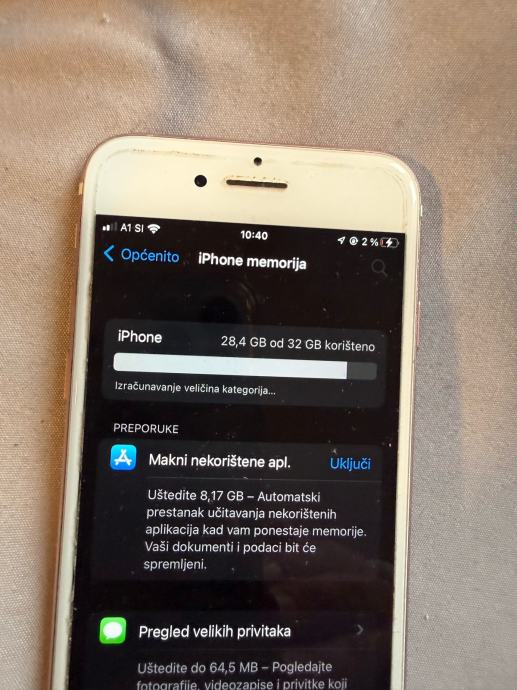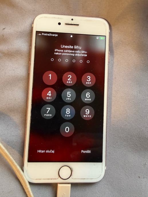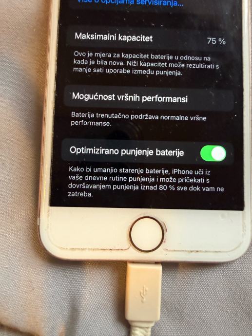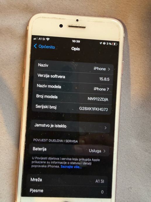 Prodam rabljen Apple iPhone 7 z 32 GB pomnilnika in 75% kapaciteto baterije. Telefon deluje normalno, ima nameščen iOS 15.8.5 in je v solidnem stanju.