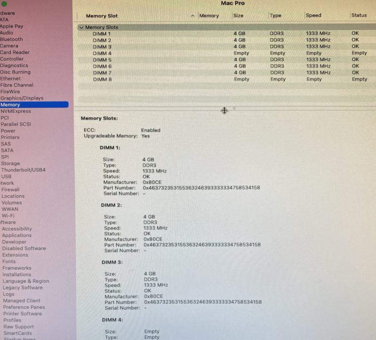 - pomnilnik: 6x 4GB DDR3 1333MHz, registered ECC, serverski pomnilnik, proizvajalca OWC. Pomnilnik je bil nadgrajen iz 6x 1GB 1066MHz Apple pomnilnika, ki ga prilagam.