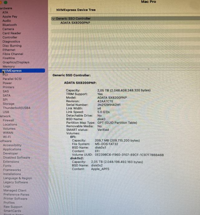 1. NVME ADATA SX8200PNP s 2TB prostora, nameščen na PCIe adapter JEYI s prostim SATA M.2 vgradnim mestom in aktivnim hlajenjem. Koristi se kot sistemski disk, hitrost prenosa podatkov dosega 1300MB/s (pisanje) in 1400MB/s (branje)