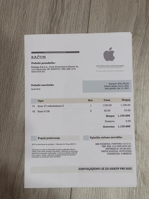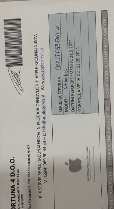 Prodam iMac 27, i7, refurbished leta 2021. Računalnik je odlično ohranjen in pripravljen za uporabo, na novo ima naložen operacijski sistem Big Sur. Predmet prodaje je samo računalnik, brez tipkovnice, miši... Na fotografijah si lahko ogledate specifikacije.