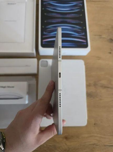 Tablični računalnik Apple iPad Pro 11" M2 (4. generacija) s pomnilnikom 128 GB in WiFi + Cellular (podpira SIM kartice) v srebrni barvi. Na tabličnem računalniku je bila nameščena kaljena stekla, ki je še vedno na njem. Poleg iPada imam še:
