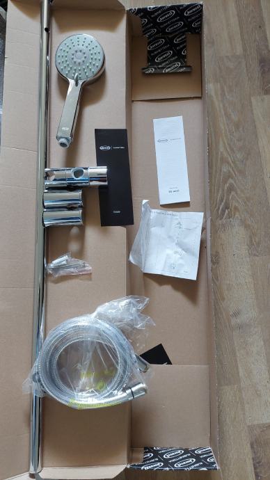 Komplet, termostatska glava, tuš ročka in stenski nosilec.