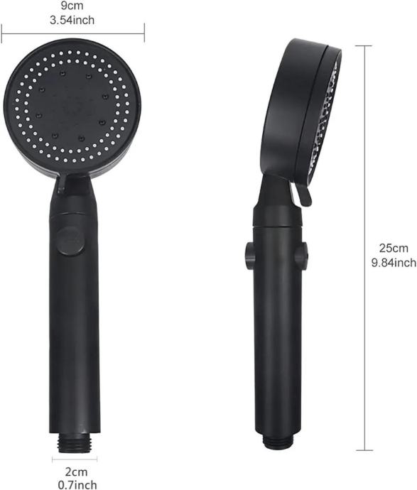 Črna tuš glava. Zasnovan za vgradnjo v standardno tuš cev. Slušalka ima funkcijo izbire načina tuširanja (5) in funkcijo STOP, ki ustavi tok. Vgrajeni ventilator poveča moč prhe brez povečane porabe vode.