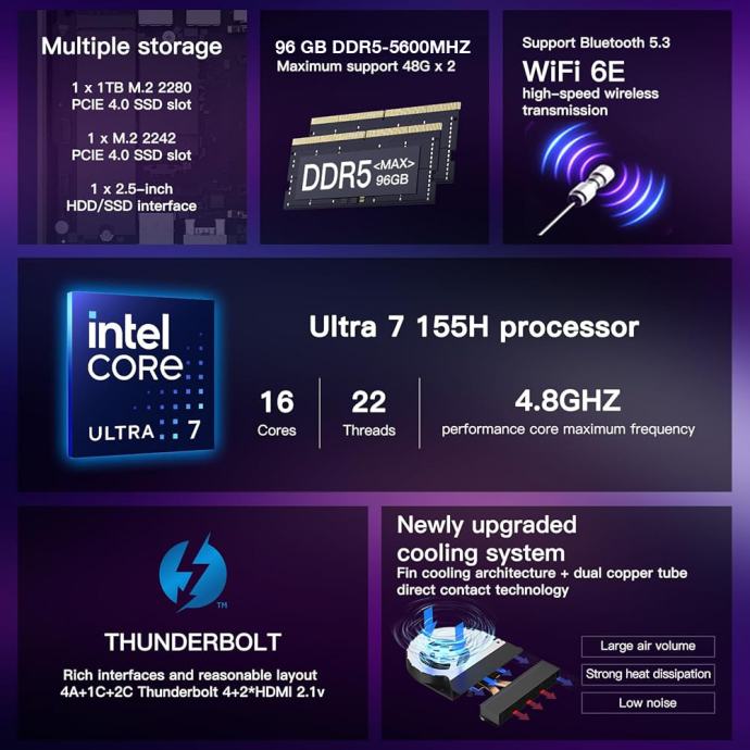 Prodam ASUS NUC 14 Pro Ultra 7 155h (model NUC14RVH-B) z 96GB DDR5 (5600 MHz) spomina in 1TB Nvme diskom (prostor je se za dodaten Nvme 2240 ali 2230 + adapter) in še za SSD ali HDD disk (je višji model, kjer je tudi hlajenje boljše). Intel Arc grafika je zelo odlična za obdelavo videa in grafike. Preko Thunderbolt 4 povezave sem ga uporabljal tudi z zunanjo enoto eGPU Breakaway Box 750ex z Nvidia grafično kartico. Asus Nuc 14 pro je zelo hiter in neslišen pri svojem delu. Podpira do 4 monitorje hkrati na resoluciji 4K.