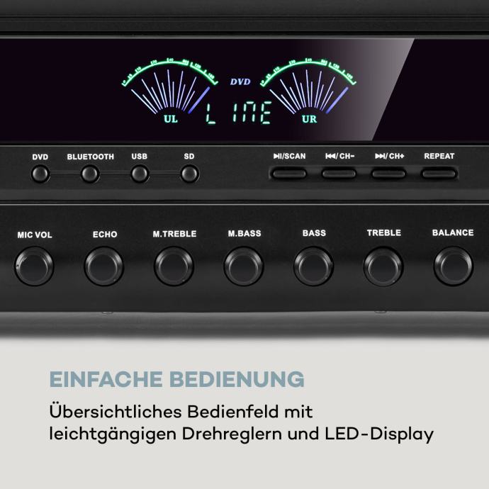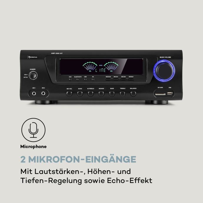 Kompakten, zmogljiv in vsestranski: spoznajte novo obliko inteligentne optimizacije zvoka z ojačevalnikom 5.0-Surround Amplifier auna AMP 3800 BT.Z vmesnikom Bluetooth lahko priročno brezžično predvajate vse glasbene datoteke iz vašega pametnega telefona ali tablice preko stereo ojačevalnika . Z izhodno močjo 2 x 120 W in 3 x 50 W ter ustreznimi vhodi na zadnji strani naprave bo vaš domači kino 5.0 podprt z najboljšim zvokom. Po želji lahko prilagodite tudi višino, base, balance in echo učinek. Auna AMP 3800 BT, 5.0 HiFi-ojačevalnik ima na sprednji strani en vhod USB in eno režo SD za enostavno predvajanje datotek MP3 ter dva vhoda za mikrofon z nastavljivimi nizkimi in visokimi toni za vašo naslednjo zabavo s karaokami. Poleg petih izhodov za zvočnike najdete na zadnji strani tudi vhod za stereo DVD in izhod za stereo linijo za posredovanje signala. Priloženi daljinski upravljalnik omogoča priročno upravljanje na daljavo.Kot univerzalno uporabna domača naprava je auna AMP 3800 BT HiFi ojačevalnik idealna obogatitev za vse navdušence inteligentnega uživanja v glasbi.