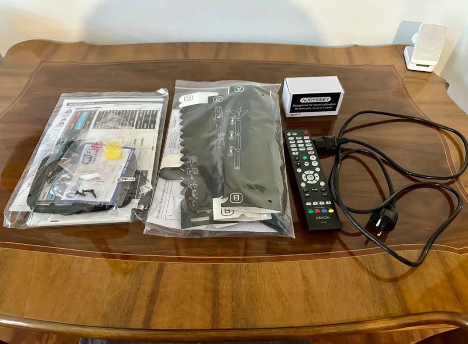 Prihaja v originalni embalaži z vsemi dodatki – kabli, antenami, daljinskim upravljalnikom, Audyssey mikrofonom in navodili. Deluje brezhibno, brez težav.