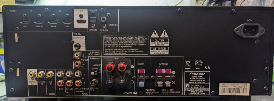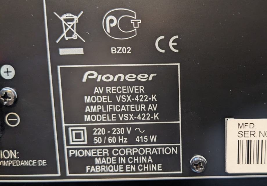Prodam VSX-422 Pioneer AV receiver za domači kino. Priloženi so: original daljinc, FM antena, navodila za uporabo, kalibracijski mikrofon in omrežni kabel.