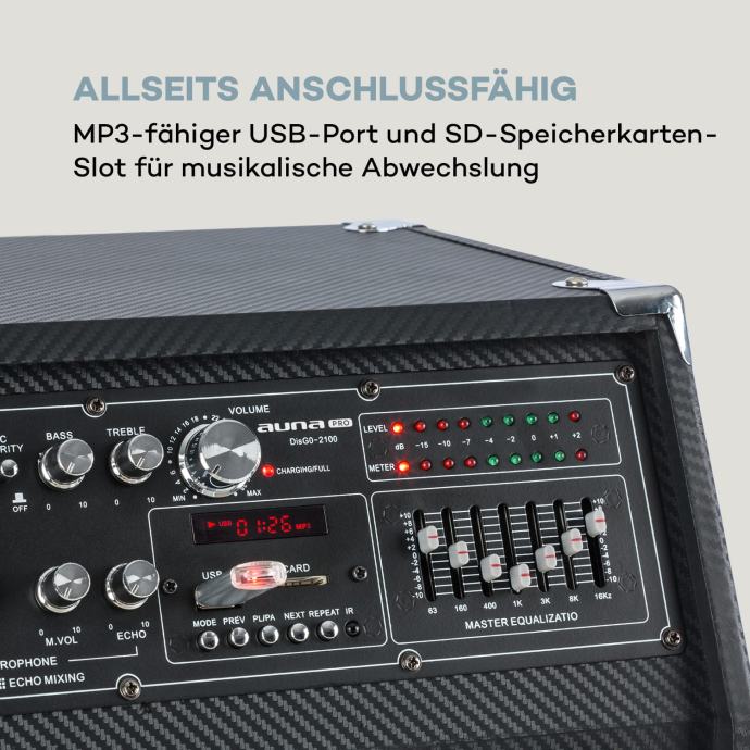 Disko na poti: s sistemom PA auna DisGo Box 2100. Večbarvne LED diode, občutljive na glasbo, pevski mikrofoni, številne možnosti povezovanja in notranja baterija zagotavljajo zvočnemu sistemu vse, kar je potrebno za party.Zahvaljujoč funkciji Bluetooth se sistem PA brezžično poveže s pametnim telefonom, tabličnim računalnikom ali prenosnikom. DisGo Box 2100 ima tudi vrata USB in SD režo za povezovanje dodatnih zunanjih medijev.Živahno srce sistema je integriran ojačevalnik, ki vodi do najvišje učinkovitosti 10-palčni nizkotonec in oba visokotonca. Močan bas in čisti visoki toni: sistem PA zagotavlja zvok brez popačenja. Visoki toni in bas se lahko prilagodijo glede na vaše lastne zvočne nastavitve.Vklopite UHF mikrofone in karaoke zabava se lahko začne. Vsak glas dopolni ločena sekcija z mikrofonom z nastavljivim učinkom odmeva in ravnotežja. Mobilni glasbeniki in zabavljači bodo za povezovanje instrumentov uporabljali 6,3 mm jack. Občutljivi uglaševalci lahko ustvarijo dinamično zvočno sliko s 7-pasovnim izenačevalnikom.Toda kakšna bi bila zabava brez ustrezne razsvetljave? Barvne LED diode sistema PA svetijo v ritmu glasbe in predstavljajo zadnjo nastavitev katerega koli mobilnega dogodka.Za lažji transport je zvočni sistem opremljen z izvlečnim ročajem in kolesi. Robusten omarica iz MDF je zaščitena s kovinskimi robovi.Za pestro zabavo: PA system DisGo Box 2100 od podjetja auna.