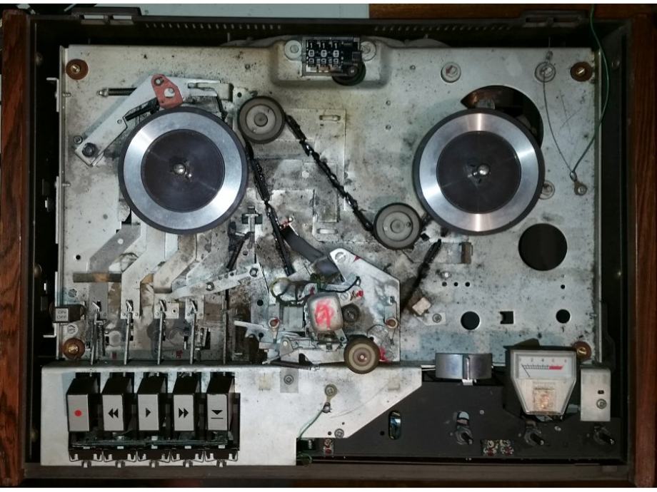 Ob vklopu se osvetli signal meter LEVEL, vrti se vetrnica na osi motorja, ob vrtenju gumba za glasnost in dotiku magnetofon. glave slišim šumenje/prasketanje v zvočniku, torej ojačevalnik deluje. Zelo verjetno bi z vstavitvijo novega gumi jermena magnetofon deloval. Razpadla pa je tudi gumi obloga vzvoda za PAUSE, ki naj bi ob vklopu pritiskala na obod levega pogon. koluta - odpadla guma je sicer zraven vzvoda.