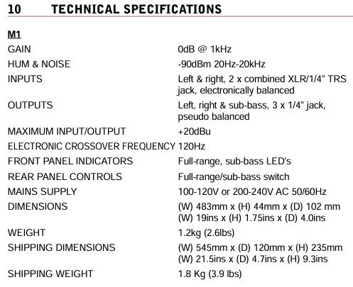 Tehnične značilnosti krmilnika M1: maksimalni vhodni nivo 20 dBu; največja izhodna raven 20 dBu; frekvenca križanja 120 Hz; napajanje 100/110/220/240 V AC 50/60 Hz; dimenzije 483x317x102 mm; teža 0,5 kg.