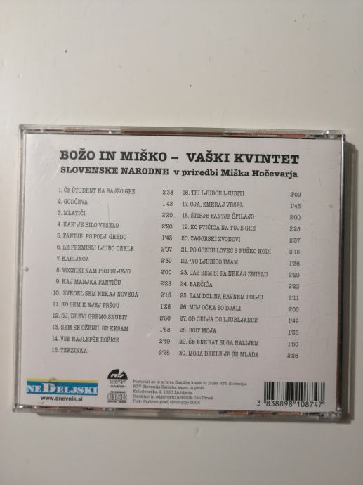 Prodam zelo lepo ohranjeno zgoščenko (cd) Božo in Miško Vaški kvintet - Slovenske narodne, je kot nova in zelo malo poslušana. Na zgoščenki je 30 tipičnih Slovenskih narodnih pesmi. Pošljem jo lahko tudi po pošti.