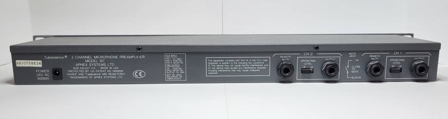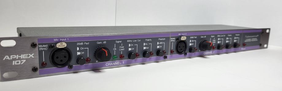 Na voljo je odlično ohranjen predojačevalec Aphex 107 Tubessence, ki je znan po svoji toplini in čisti cevni obdelavi zvoka. Idealna rešitev za katerokoli domače ali profesionalno snemalno okolje, ki potrebuje visoko kakovostno zvočno obdelavo.