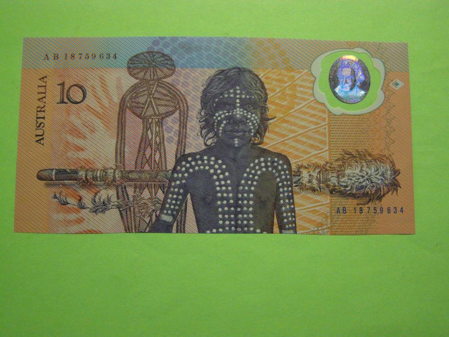 Prodam POLIMERNI PRILOŽNOSTNI bankovec za 10 Dolarjev iz Australije - ABORIGIN (10 AUD), kot ga lahko vidite na fotografijah. Bankovec je povsem nov, vendar aUNC kvalitete.