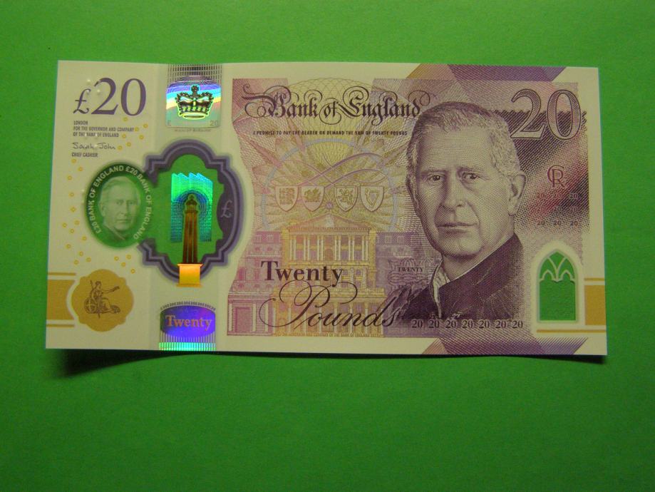 Prodam POLIMERNI bankovec za 20 Funtov (20 GBP) iz Velike Britanije - kralj Karel III, kot ga lahko vidite na fotografijah. Bankovec nikoli v obtoku, povsem nov in UNC kvalitete.