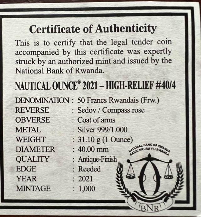 Redka ULTRA HIGH RELIEF edicija priljubljene serije Nautical ounce. Impozanten kovanec z globino reliefa kar 4mm!