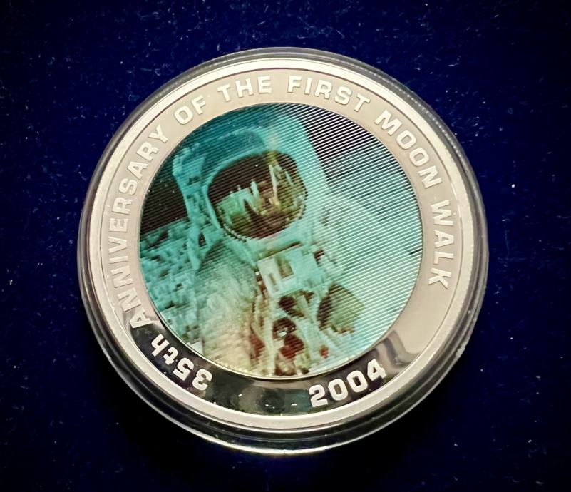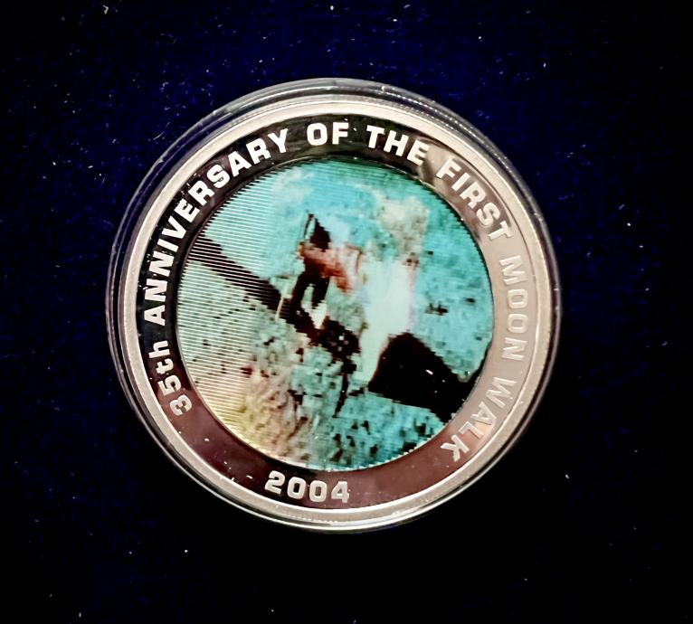 Kovanec izdan na 35. obletnico prvega pristanka na luni, misija Apollo 11, julija 1969. V sredino kovanca je nameščena podoba, ki se spreminja glede na zorni kot in tako prikazuje 3 različne slike: vzlet rakete Saturn, pristanek modula Apollo na luni ter prvega človeka na luni.