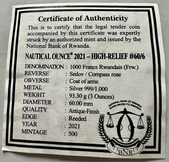 Redka ULTRA HIGH RELIEF edicija priljubljene serije Nautical ounce. Impozanten 3 unčni kovanec z globino reliefa kar 8mm!
