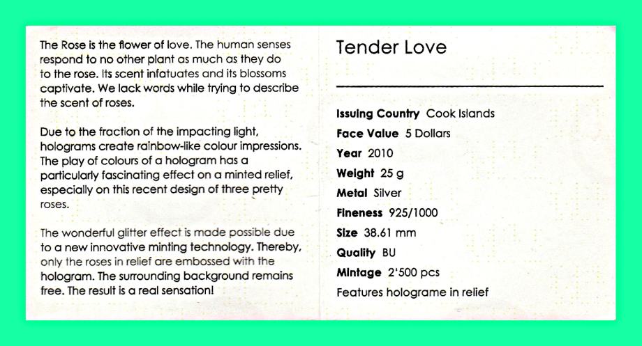 Novo odkrita tridimenzionalna hologramska tehnika v kovanju srebrnikov ustvarja na cvetovih vrtnic mavrične, prelivajoče se barve. Igra teh barv fascinira gledalca, ki obrača srebrnik pod raznimi koti vpadne svetlobe, da dobi čim več mavričnih prelivov na cvetu vrtnice.