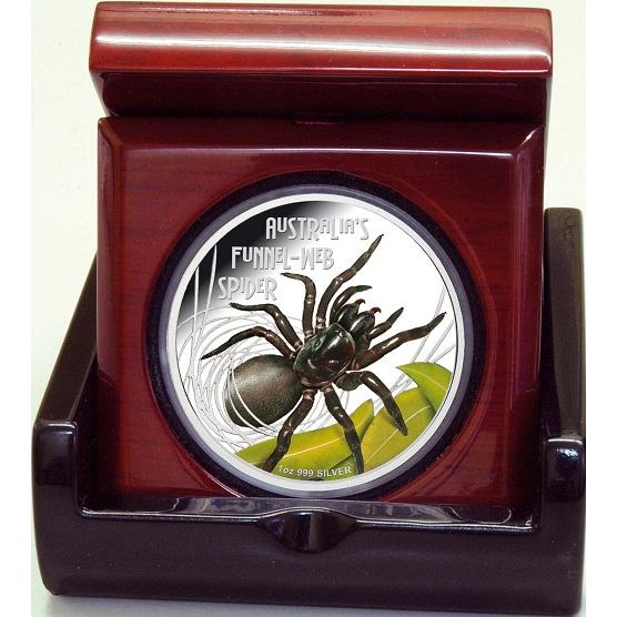 Prodam 1oz srebrnik (proof - poliranec) z barvnim motivom lijakastega pajka (Funnel Web Spider 2012), ki je 7. v seriji smrtonosni in nevarni (Deadly & Dangerous). Srebrnik se nahaja v zaščitni kapsuli, ta pa skupaj s certifikatom v škatlici, kot je razvidno iz fotografij.