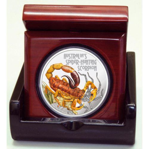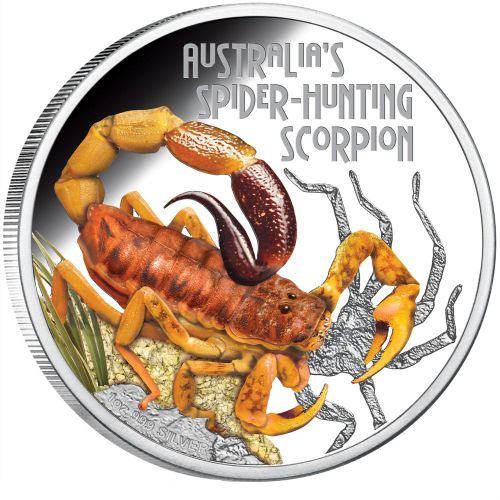 Prodam 1oz srebrnik (proof - poliranec) z barvnim motivom škorpijona, ki lovi pajke (Spider-Hunting Scorpion 2014), ki je 9. v seriji smrtonosni in nevarni (Deadly & Dangerous). Srebrnik se nahaja v zaščitni kapsuli, ta pa skupaj s certifikatom v škatlici, kot je razvidno iz fotografij.