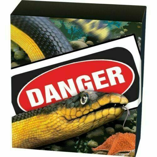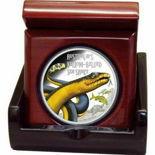 Prodam 1oz srebrnik (proof - poliranec) z barvnim motivom rumeno trebušne morske kače (Yellow-Bellied Sea Snake 2013), ki je 8. v seriji smrtonosni in nevarni (Deadly & Dangerous). Srebrnik se nahaja v zaščitni kapsuli, ta pa skupaj s certifikatom v škatlici, kot je razvidno iz fotografij.