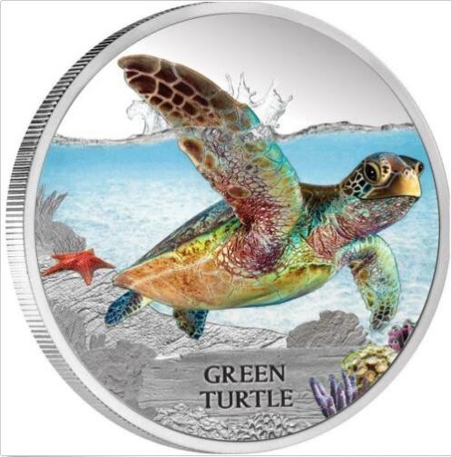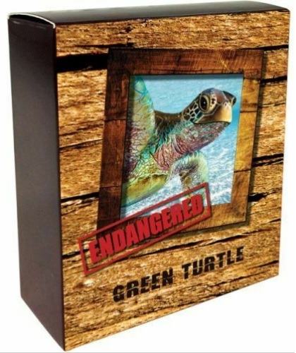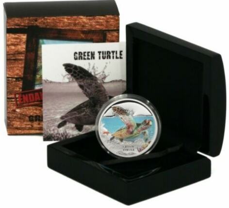 Prodam 1oz srebrnik (proof - poliranec) z barvnim motivom zelene želve (Green Turtle 2014), ki je 4. v seriji ogroženi in izumrli (Endangered & Extinct). Srebrnik se nahaja v zaščitni kapsuli, ta pa skupaj s certifikatom v škatlici, kot je razvidno iz fotografij.