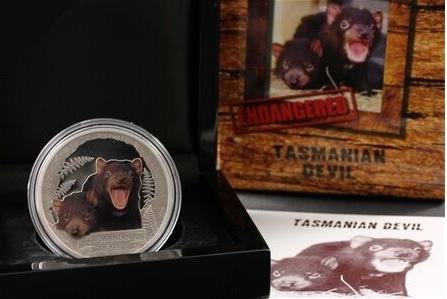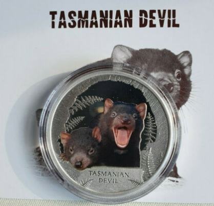 Prodam 1oz srebrnik (proof - poliranec) z barvnim motivom tasmanskega vraga (Tasmanian Devil 2013), ki je 3. v seriji ogroženi in izumrli (Endangered & Extinct). Srebrnik se nahaja v zaščitni kapsuli, ta pa skupaj s certifikatom v škatlici, kot je razvidno iz fotografij.