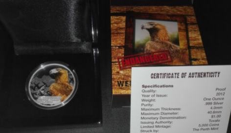 Prodam 1oz srebrnik (proof - poliranec) z barvnim motivom tasmanskega repatega orla (Tasmanian Wedge-Tailed Eagle 2012), ki je 2. v seriji ogroženi in izumrli (Endangered & Extinct). Srebrnik se nahaja v zaščitni kapsuli, ta pa skupaj s certifikatom v škatlici, kot je razvidno iz fotografij.