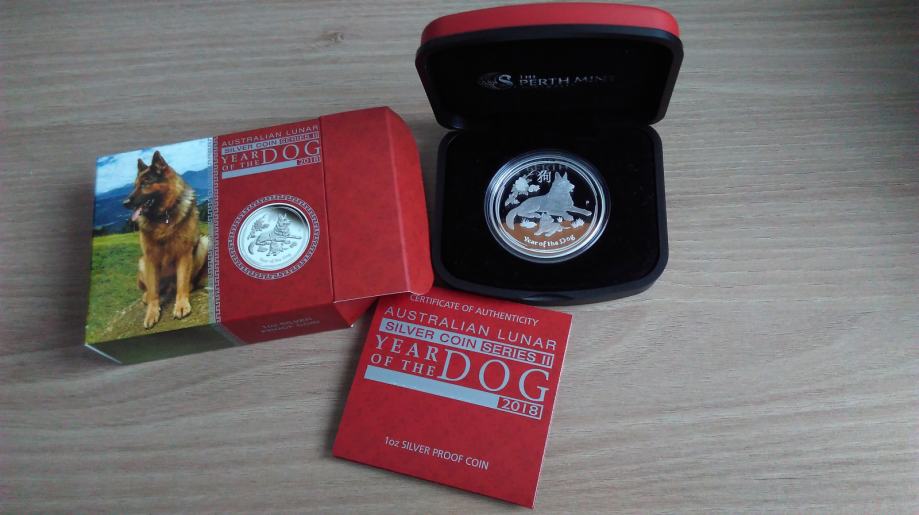 Prodam 1oz srebrnik (proof - poliranec) z motivom psa (Year of the Dog 2018), druge lunarne serije, ki se nahaja v zaščitni kapsuli, ta pa skupaj s certifikatom v škatlici, kot je razvidno iz fotografije.