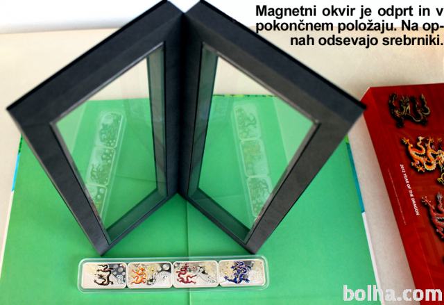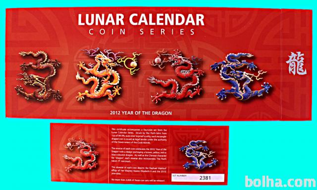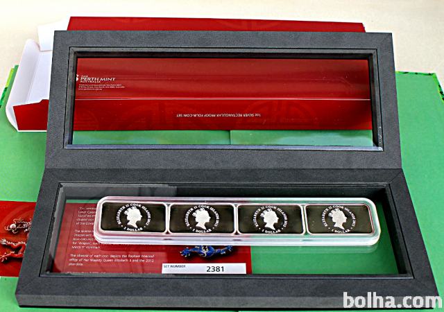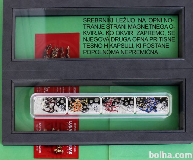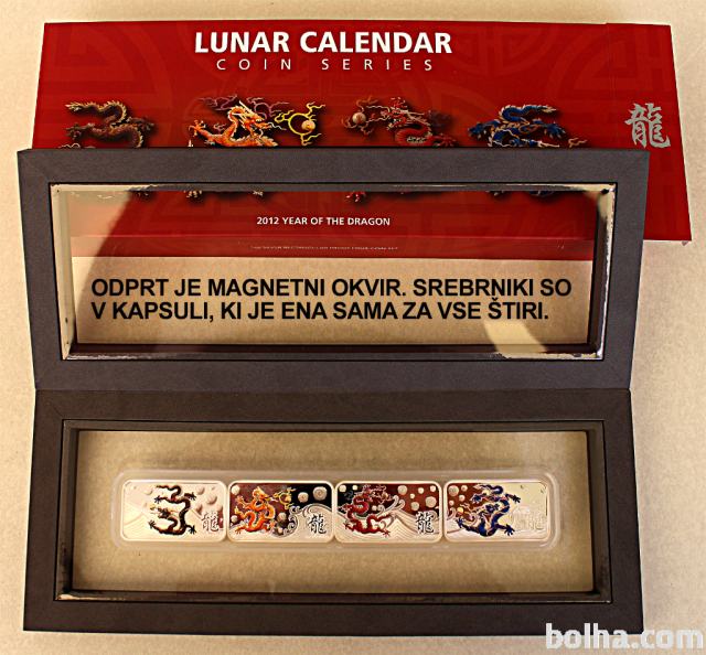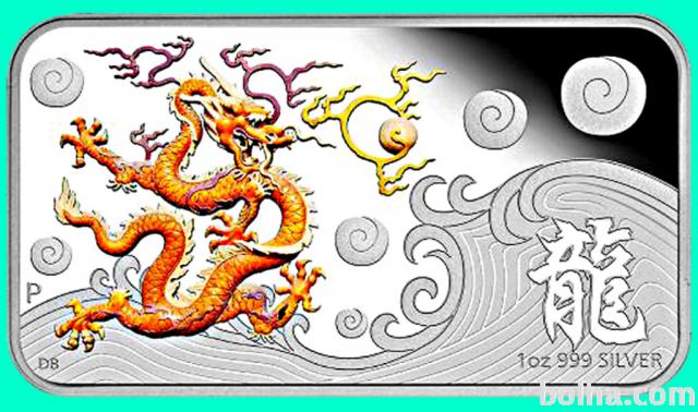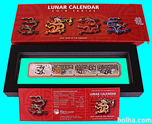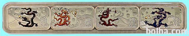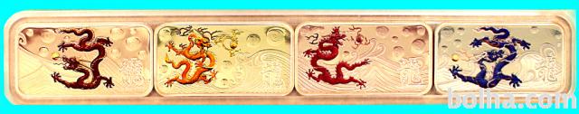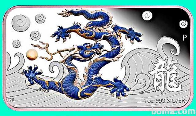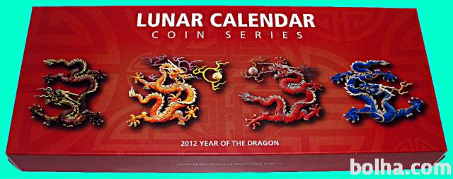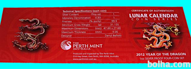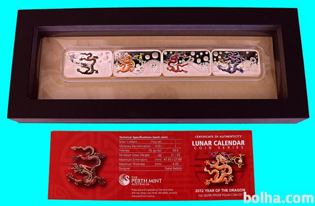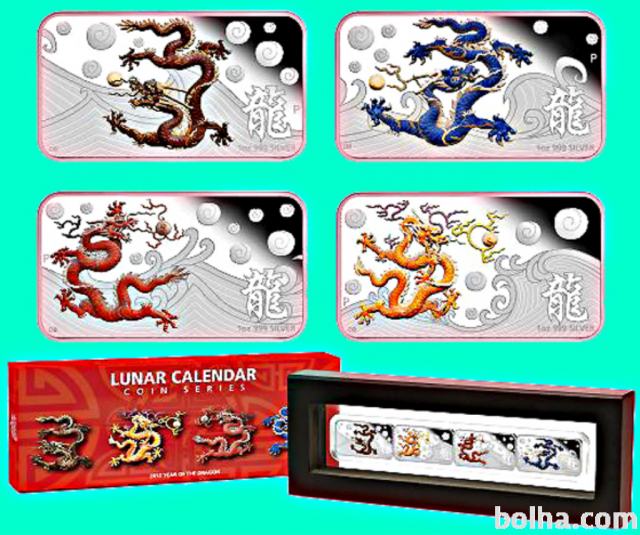 Svetovno znana avstralska kovnica Perth Mint je izdala tudi leta 2012 srebrnike z motivom kitajskega zmaja, ker je po kitajskem luninem koledarju to leto, leto zmaja. Prodajam štiri srebrnike prestižne izdelave, kjer je osrednji lik zmaj. Zmaji so izdelani v štirih barvah: rjavi, rumeni, rdeči in modri.