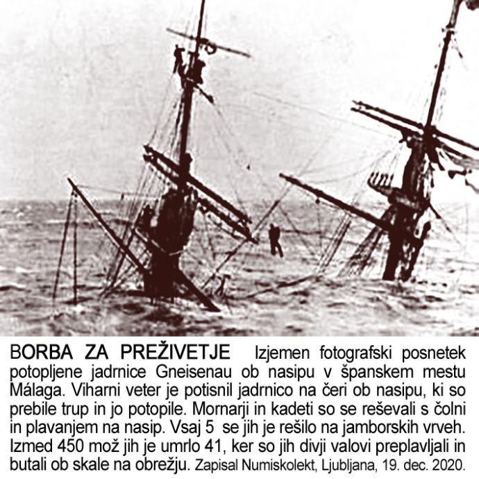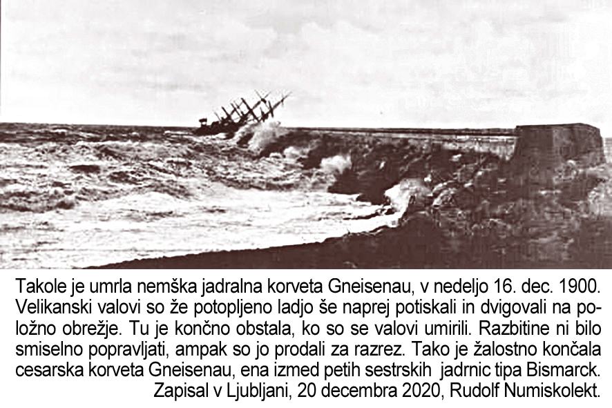 SMS (Seiner Majestät Schiff) Gneisenau je bila manjša vojaška jadrnica - korveta razreda Bismarck. Zgradili so jo za nemško cesarsko mornarico leta 1870. Poimenovali so jo po pruskem feldmaršalu Gneisenauu. Bila je peta jadrnica tega razreda. Služile so kot izvidnice flote na dolgih turnejah do kolonij nemškega cesarstva. Gneisenau je bila naročena ladjarju junija 1877, splavljena septembra 1879 in vključena v floto oktobra 1880. Oborožili so jo s štirinajstimi topovi, kalibra 15 cm, in dodali parni pogon za dolga križarjenja. V prvem desetletju je opravila dve pomembni poslanstvi. Leta 1882 je ščitila nemške državljane v Egiptu proti upornikom Urabi, med leti 1884 do 1886 pa je bila osredotočena na zaščito nemških interesov v vzhodni Afriki in kasneje v kolonijah na tihomorskih otokih. Leta 1887 je postala, za več kot eno desetletje, šolska jadrnica. S kadeti je križarila po Indijskem oceanu in Sredozemlju. Ko so se izšolali so dopolnjevali kadre nemške flote. Učna križarjenja so bila na velikih razdaljah med Zahodno Indijo in Sredozemljem. Toda 16. decembra 1900 je ladja zapeljala proti pristaniškemu nasipu starodavnega španskega mesta Málaga, ki leži ob Sredozemlju, kakih 100 km vzhodno od Gibraltarja. Nenaden močan veter, ki je hitro prešel v vihar, je potisnil jadrnico v skalovje pred nasipom in jo razbil. Od 450 mož je umrlo 41 mornarjev, kadetov in oficirjev. Razbitino ni bilo vredno reševati. Prodali so jo za staro železo.