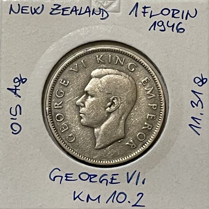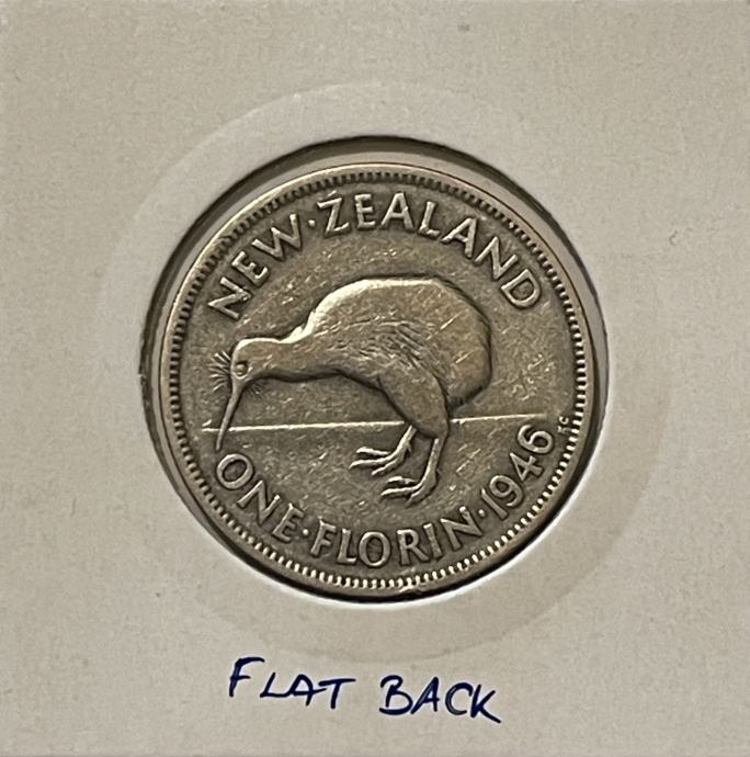 New Zealand 1 Florin1946 km 10.2 - Kiwi flat back, redkejši.