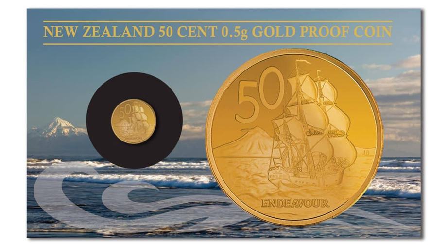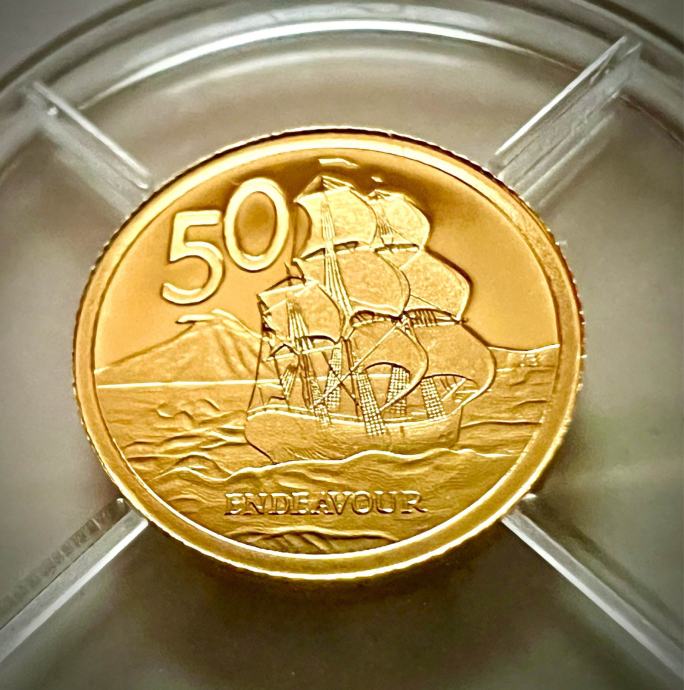 Zlata izdaja ikoničnega novozelandskega kovanca za 50 centov, na katerem se, že od leta 1967, nahaja znamenita ladja Endeavour, s katero je Kapitan Cook prvič pristal na Novi Zelandiji.