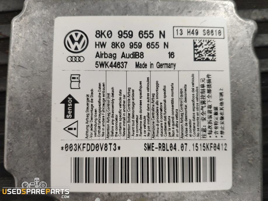 Modul za zračno blazino (Airbag modul) je elektronska komponenta, ki nadzoruje delovanje zračne blazine v vozilu. Ta modul je zasnovan za uporabo v vozilih Audi A4 B8, izdelanih leta 2015. Njegova funkcija je, da zazna nesrečo in aktivira zračno blazino, da bi zaščitil potnike v vozilu. Modul ima številko dela 8K0959655N in je pomemben del elektronskega sistema vozila, ki zagotavlja varnost potnikov.Znamka: Audi
