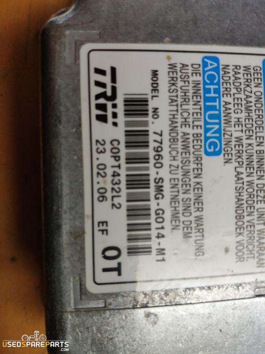 Modul za zračno blazino (Airbag modul) je elektronska komponenta, ki nadzira delovanje zračne blazine v vozilu. Ta del je ključen za varnost voznikov in potnikov, saj omogoča pravilno aktivacijo zračne blazine v primeru nesreče. Del je primeren za vozila Honda Civic, proizvedena med letoma 2006 in 2011, z dizelskim motorjem 2.2 L. Delovni kodi za ta del so 77960SMGG014M1 in 77960-SMG-G014-M1.Znamka: Honda