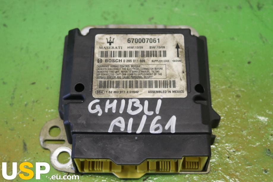 Modul za zračne blazine je ključni del sistema za varnost v vozilu. Z njim se aktivirajo zračne blazine in pasovi varnosti v primeru trka. Ta modul je namenjen vozilom Maserati Ghibli in je odgovoren za shranjevanje podatkov o trku. Po aktivaciji zračnih blazin ali pasov varnosti je potrebno modul ponovno nastaviti, da se izbrišejo shranjeni podatki o trku in se aktivira svetilka za zračne blazine.Letnik: 2014