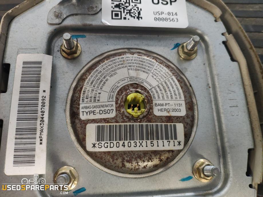 TYPE-DS07Voznikov zračni meh (airbag) za Nissan Micra K12, izdelan med leti 2003 in 2010. Kataložna številka TYPE-DS07. Nameščen je v volanu in je ključni varnostni element, ki se v primeru trčenja hitro napihne in zaščiti voznika. Zračni meh je črne barve in je del sistema za pasivno varnost SRS (Supplemental Restraint System). Pri menjavi je potrebna previdnost, saj gre za pirotehnični element. Pred namestitvijo je priporočljivo preveriti združljivost z vašim modelom vozila. Ob nepravilnem delovanju lučke za zračno blazino je potrebno opraviti diagnostiko in odpraviti morebitne napake v sistemu SRS.Znamka: Nissan