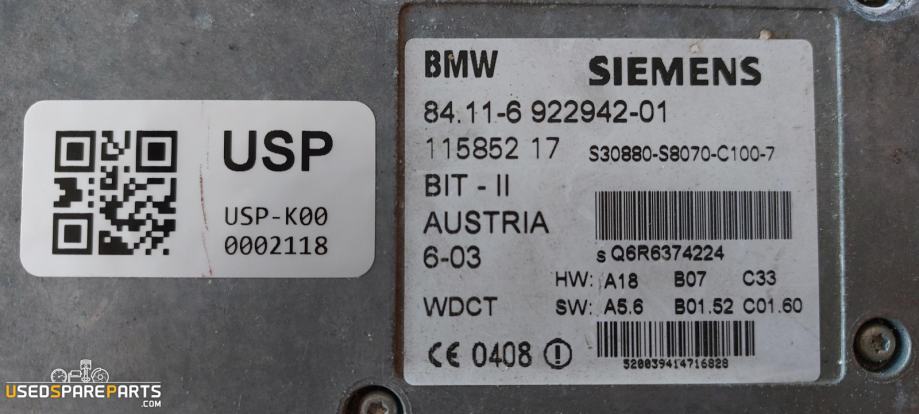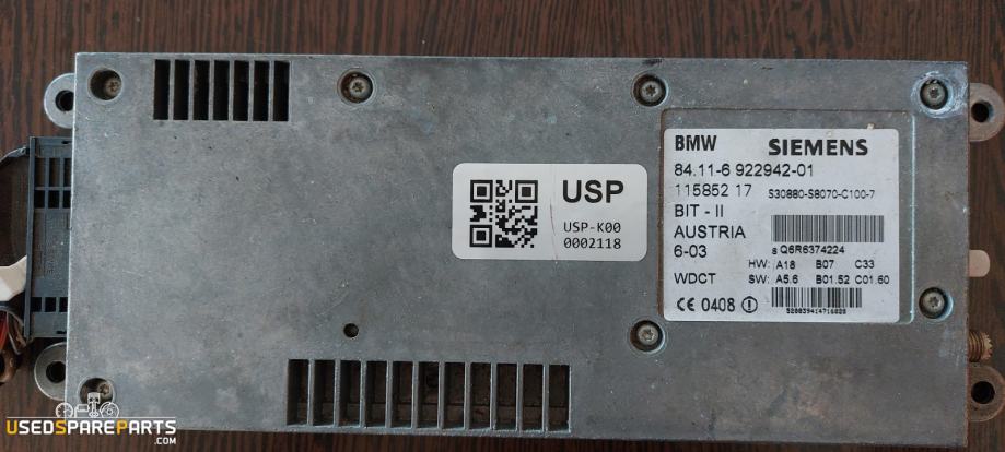 Modul za brezžično povezavo (ECU Telefon Bluetooth enota/modul) je elektronska komponenta, ki omogoča brezžično povezavo med mobilnim telefonom in avtomobilskim sistemom. Ta modul, ki ga proizvaja Siemens, je posebej zasnovan za BMW E-serijo in omogoča uporabnikom, da brezžično povežejo svoje telefone z avtomobilskim sistemom, kar jim omogoča klicanje, sprejemanje klicev in upravljanje glasbe preko volanskega krmila. Modul deluje v skladu s standardi Bluetooth in zagotavlja stabilno in varno povezavo.