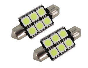 Kakovostne 24V LED žarnice, s katerimi lahko zamenjate klasične sofitne žarnice C5W, dolžine 36 mm. V kompletu sta 2 LED žarnici, vsaka ima 6 LED diod, njihova bela svetloba bo vašemu vozilu dala moderen videz. V novejših vozilih s kontrolo pregorelih žarnic je priporočljiva uporaba skupaj z Mline upornikom za LED žarnice. V primerjavi s klasičnimi žarnicami imajo LED žarnice daljšo življenjsko dobo, se manj segrevajo, zato je tudi poraba energije manjša. Uporabljajo se za notranjo osvetlitev vozila, bočne smerokaze, osvetlitev registrske tablice, osvetlitev notranjega predalčnika in osvetlitev prtljažnika.