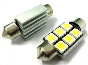 Kakovostne LED žarnice, s katerimi lahko zamenjate klasične sofitne žarnice C5W, dolžine 36 mm. V kompletu sta 2 LED žarnici, vsaka ima 6 LED diod in ohišje iz aluminija, njihova bela svetloba bo vašemu avtomobilu dala moderen videz. V novejših vozilih s kontrolo pregorelih žarnic je priporočljiva uporaba skupaj z Mline upornikom za LED žarnice. V primerjavi s klasičnimi žarnicami imajo LED žarnice daljšo življenjsko dobo, se manj segrevajo, zato je tudi poraba energije manjša. Uporabljajo se za notranjo osvetlitev vozila, bočne smerokaze, osvetlitev registrske tablice, osvetlitev notranjega predalčnika in osvetlitev prtljažnika.