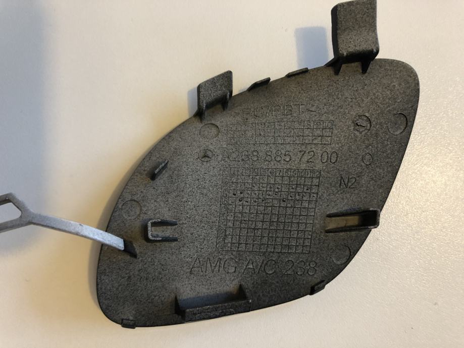 Prodam nov, original pokrovček za vleko vozila za znamko Mercedes Benz E klass limozino/karavan, coupe/cabrio za AMG odbijače. Lahko da paše tudi na avantgarde odbijač. Pokrovček je nov, brez poškodb. Barva je obsidian schwarz metallic 9197. Kataloška številka je A2388857200