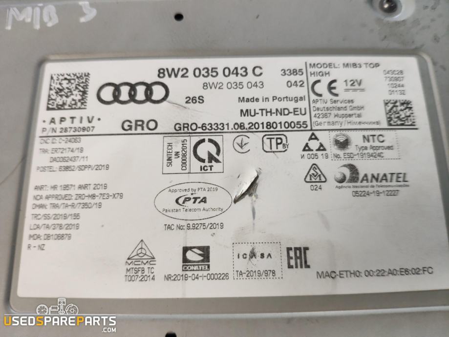Multimedijski sistem MMI MIB3 je napredni sistem za upravljanje z avtomobilom, ki vključuje navigacijo, zvočni sistem in drugo. Deluje na osnovi operacijskega sistema MIB3 in je kompatibilen z avtomobili Audi A4 B9. Sistem omogoča uporabnikom dostop do različnih funkcij, kot so navigacija, glasovna komanda, Bluetooth povezava in drugo. Del je označen s številko 8W2035043C in je primeren za modele Audi A4 B9 iz leta 2019 in kasneje.