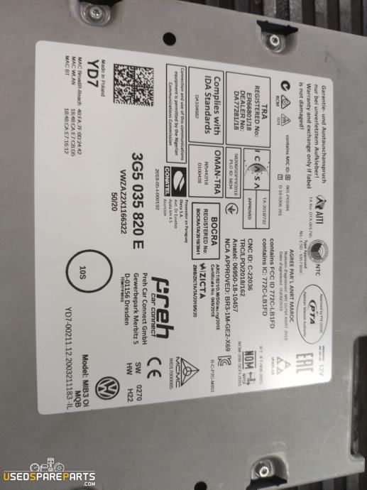 Multimedijski modul MIB3 (3G5035820E) je originalni del Volkswagen AG, ki omogoča uporabo navigacije, radija, Bluetooth povezave in drugih funkcij v vozilu. Vključuje tudi aktivirano brezžično App-Connect (Apple CarPlay in Android Auto), DAB+ tuner, najnovejše karte Evrope in aktivirano glasovno upravljanje. Primeren je za vozila, ki so bila izdelana po letu 2019 in kasneje. Modul je popolnoma aktiviran in odblokiran za enostavno namestitev.