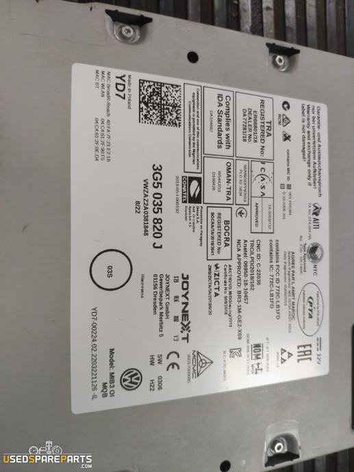 Multimedijski modul MIB 3 za Volkswagen T-Roc iz leta 2018. Ta del je ključen za delovanje multimedijskega sistema v vozilu, vključno z navigacijo, povezljivostjo in zvokom. Deluje v povezavi z drugimi elektronskimi komponentami v vozilu, zagotavlja uporabniku prijazen in intuitiven vmesnik za upravljanje z različnimi funkcijami, kot so predvajanje glasbe, navigacija in povezljivost z mobilnimi napravami.