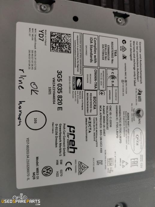 Multimedijska enota MIB3 za Volkswagen Passat B8 iz leta 2019. Ta del vključuje funkcije kot so radio, CD, DVD, GPS in navigacija. Del je označen s številko 3G5035820E in je primeren za vozila Passat B8. Del je del sistema MIB3, ki zagotavlja širok spekter multimedijskih funkcij, vključno z brezžično povezavo in možnostjo uporabe digitalnega ključa.