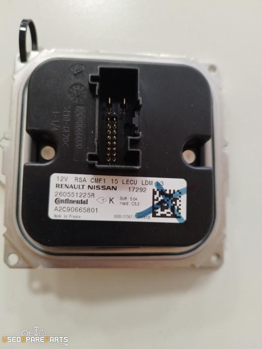 Modul z oznako 260551225R je elektronska enota, ki upravlja LED žaromete, posebej Pure LED Vision sisteme, nameščene v vozilih Renault in Nissan. Gre za originalni nadomestni del, ki zagotavlja optimalno delovanje osvetlitve ceste, izboljšuje vidljivost in varnost med vožnjo. Modul nadzoruje delovanje LED luči, kar vključuje vklop, izklop in prilagajanje svetlobnih funkcij glede na vozne pogoje. Ta komponenta je ključna za pravilno delovanje sodobnih LED žarometov in je izdelana za dolgo življenjsko dobo ter zanesljivost v različnih vremenskih razmerah.