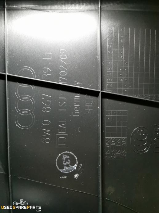 Notranja obloga B stebrička je del notranje opreme vozila, ki pokriva spodnji del stebrička na levi strani vozila. Ta del je pomemben za estetsko podobo vozila in hkrati tudi zaščiti notranjost vozila pred zunanjimi vplivi. Notranja obloga B stebrička je izdelana iz kvalitetnih materialov, ki zagotavljajo trajnost in odpornost proti obrabi. Ta del je primeren za vozila Audi A4 Avant 2016 in je označen s številko dela 8W0867239.Znamka: Audi
