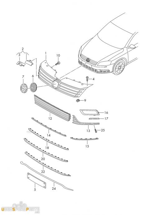 SLIKA JE SIMBOLIČNA, ŠTEVILKA 15 NA SHEMI.Okrasna letva sprednjega odbijača je kosovni del, ki se uporablja za okrasitev sprednjega dela vozila. Ta del je posebej zasnovan za model VW Passat B7 R-Line in služi kot okrasni element, ki doda vozilu športni izgled. Del je označen s številko 3AA853764C2ZZ in je kompatibilen samo z modelom Passat B7 R-Line iz let 2011 do 2015.Znamka: Volkswagen