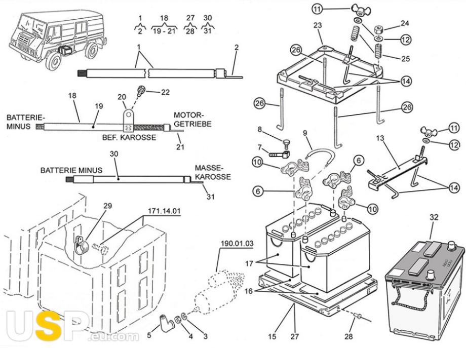 Številka 14 na sliki.Palica za fiksacijo akumulatorja je del, ki zagotavlja stabilnost in varnost akumulatorja v vozilu. Pripomoček je pomemben za preprečevanje premikanja akumulatorja med vožnjo, kar bi lahko povzročilo poškodbe ali okvare. Uporablja se za različna vozila, vendar podatkov o specifičnih znamkah ali modelih ni na voljo.